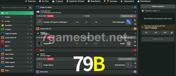 O 79B oferece uma grande seleção de opções de apostas em e-sports com probabilidades competitivas